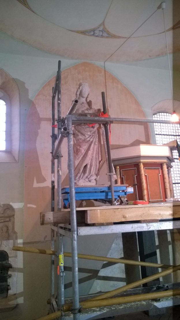 Am 21. November 2018 war es so weit. Die Horburger Madonna hat ihren neuen Standort im Kirchenraum auf einem neu geschaffenen Sockel eingenommen. Das ist nun die Erfüllung des gutachterlichen Gebots von 2011, die lebensgroße Skulptur vor Salzeintrag aus der Kirchenwand zu schützen. Der Transport erfolgte reibungslos. Die Steinmetze und der Gerüstbauer hatten ganze Arbeit geleistet. Die empfehlen wir gerne weiter.